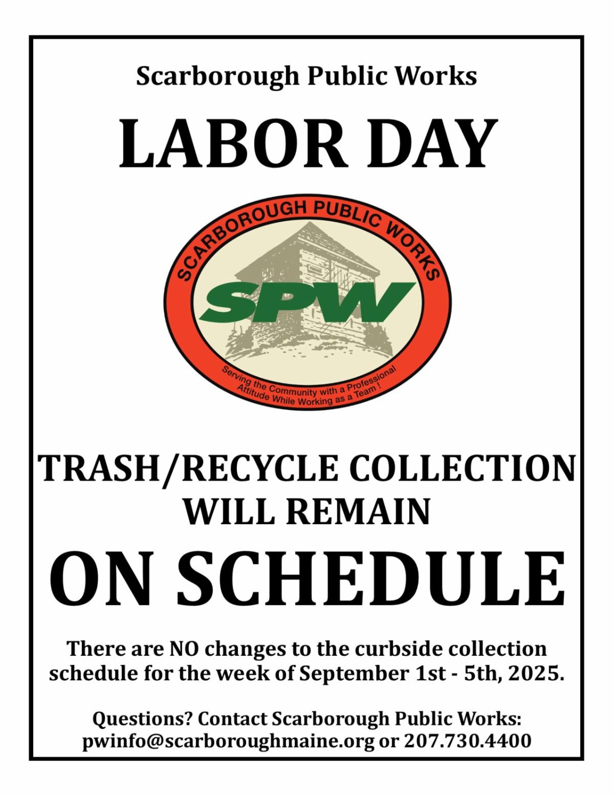 | Town of Scarborough Newsletter | | The start of a new school year has arrived and Fall is approaching! Road work, Council decision-making, and community events all continue into the coming season. Read on for more insight on these topics, as well as for information on our new tax rate and getting signed up for some fun fall programs! We hope you find our newsletters to be a helpful source of Town news, and a launching point to our website to dive deeper into your areas of interest, meeting minutes, and more. | | Town Offices are closed today, Monday, September 1, in observance of Labor Day. Trash pickup remains on schedule. | | Labor Day Week Trash Collection (No Changes) | | Trash collection will remain on schedule for Labor Day week, September 1-5, 2025. Questions? Contact our Public Works department at pwinfo@scarboroughmaine.org or 207.730.4400. | |