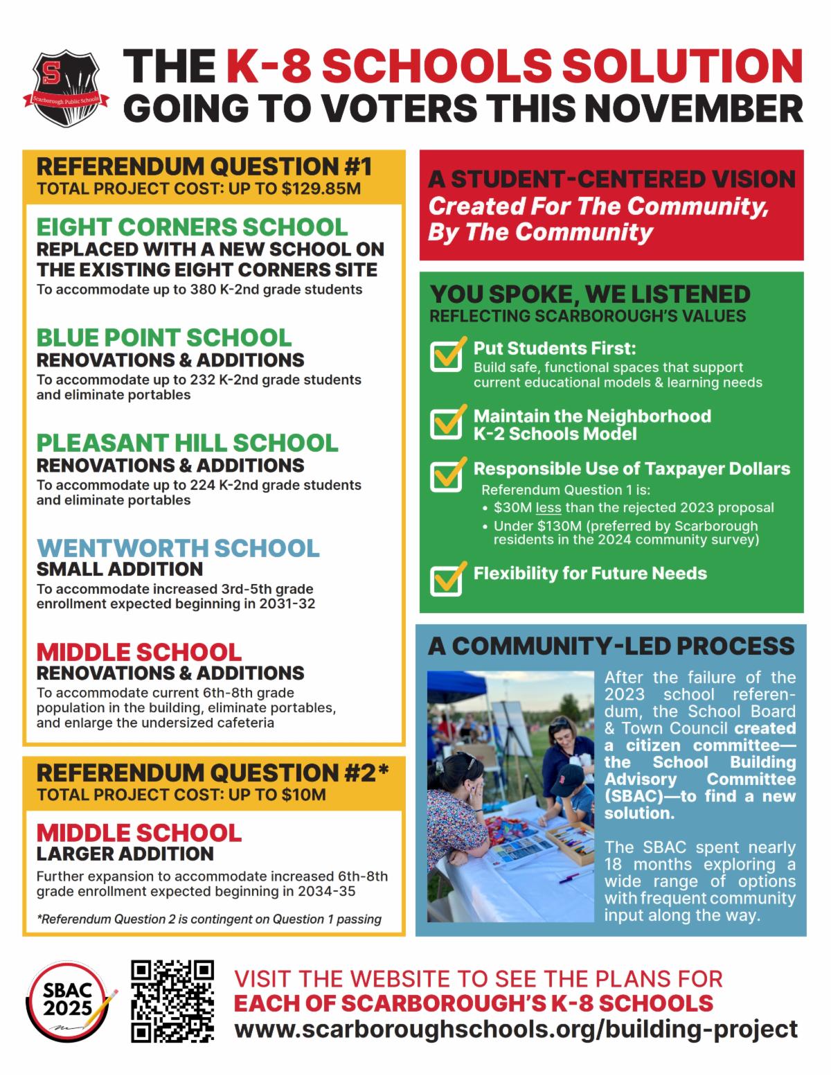 | | Referendum Question 2: A second referendum question asks for a further addition to the Middle School to accommodate increased enrollment expected in 2024, with a total project cost of up to $10M (contingent on the first question passing). | | As Scarborough’s families head into a new school year, the District and School Building Communications Committee have been hard at work answering questions from the community and putting together resources for those who want to know more about the proposed K-8 Schools Solution heading to voters this November. The project informational website has gotten some significant updates and we invite you to check them out and share them with your fellow community members! | | | November Election: Request an Absentee Ballot | |