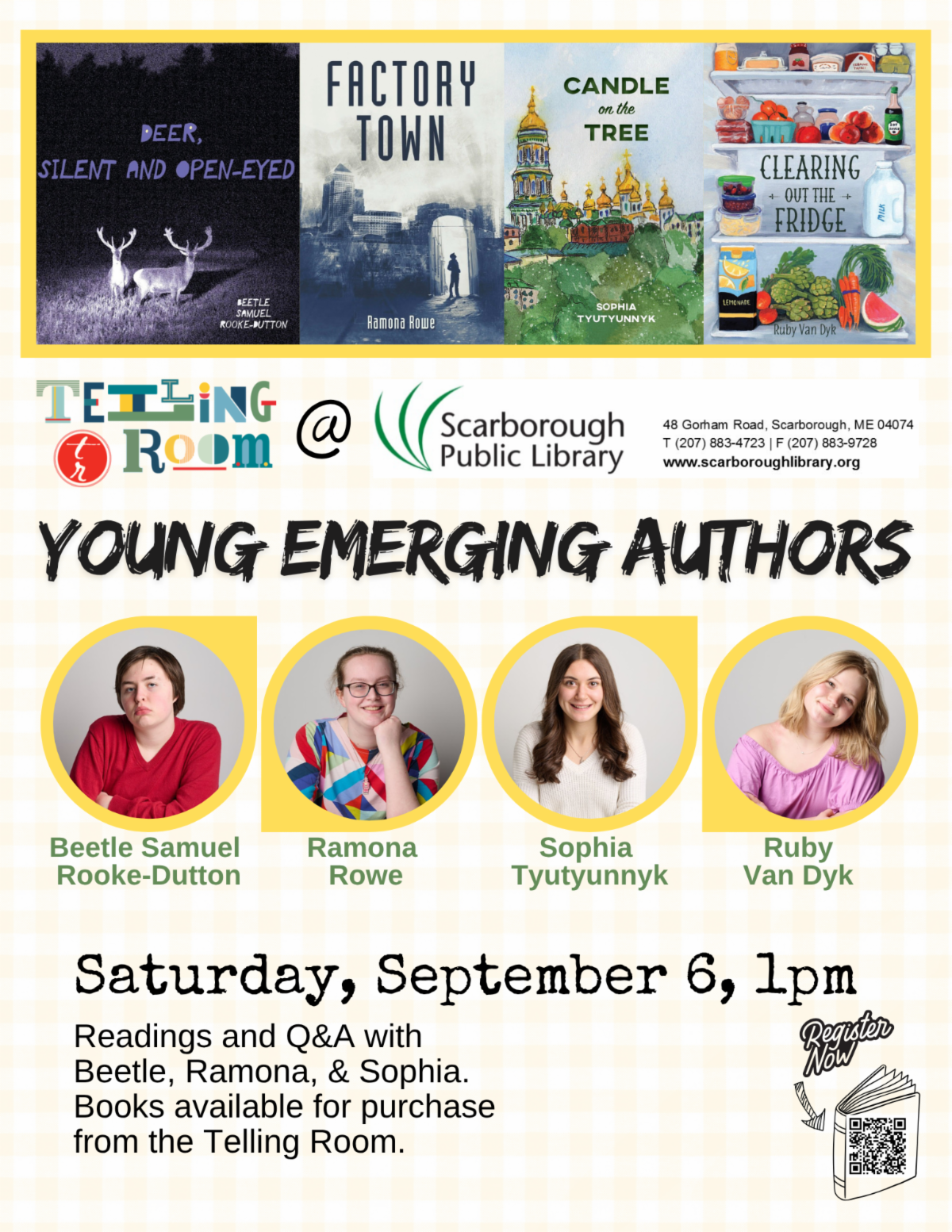 The Telling Room's Young Emerging Authors program selects four young writers each year to work on a longform work—a novel, a book of poetry, or other creative writing. This year's writers are Beetle Rooke-Dutton, Ramona Rowe, Sophia Tyutyunnyk, and Ruby Van Dyk. Beetle, Ramona, and Sophia will read from their newly published works and talk about the writing experience. Books will be available for purchase through The Telling Room.