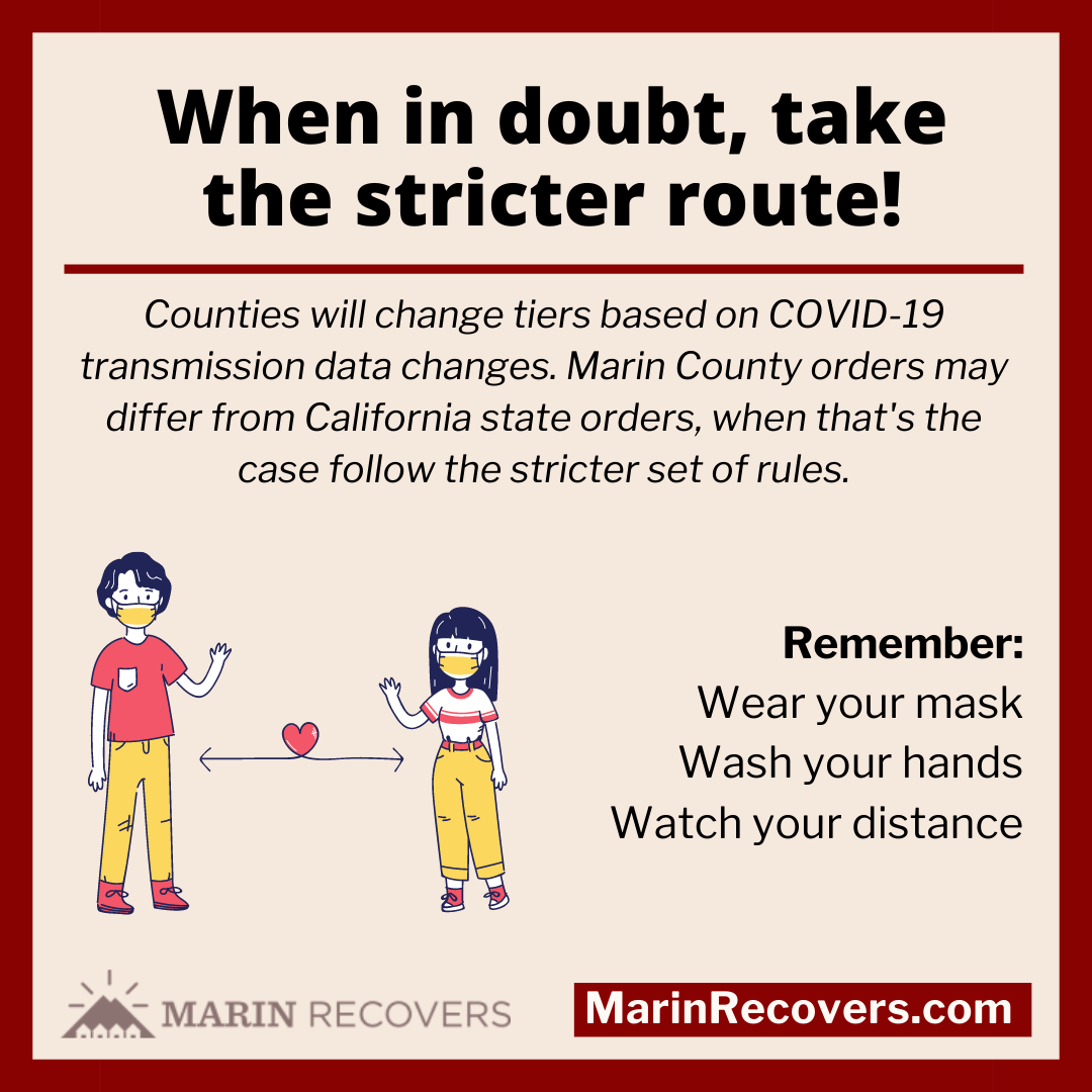 The updated status of businesses and industries reopenings in Marin County can be found at MarinRecovers.com.
