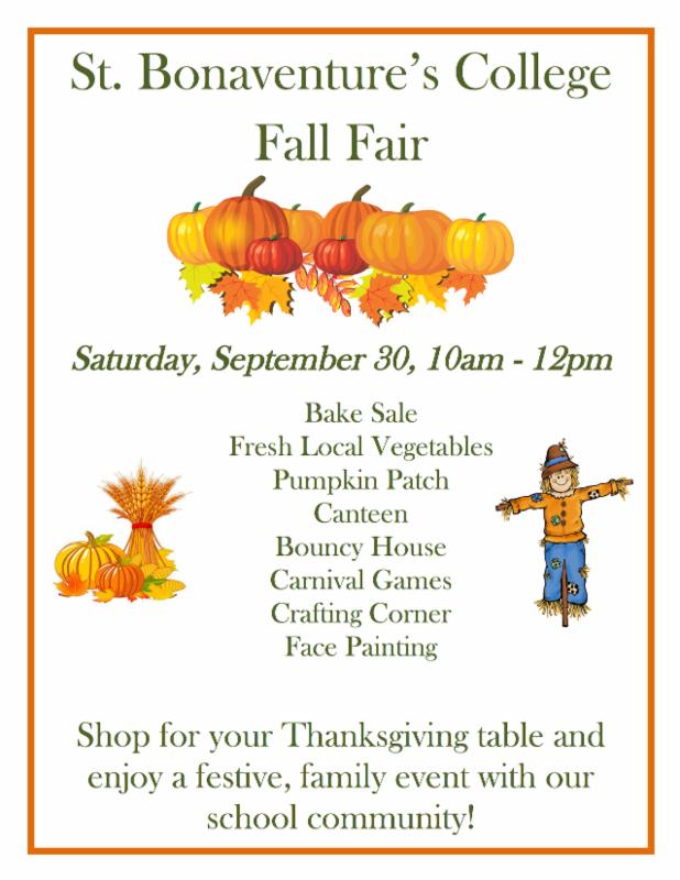 - St. Bonaventure's College Fall Fair, this Saturday, September 30th, 10a.m. - 12p.m. Bake sale, fresh local veggies, pumpkin patch, crafts, canteen, carnival games and more!