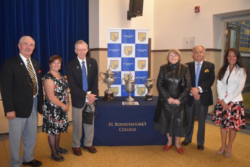 From left: Gary Browne '63, Principal Annette Mallay, Dr. Neil Glabraith, Mrs. Mavourneen Galbraith, President Tom McGrath and Board Chair Ms. Barbara Mason with St. Bon's trophies bearing Nangle's name.