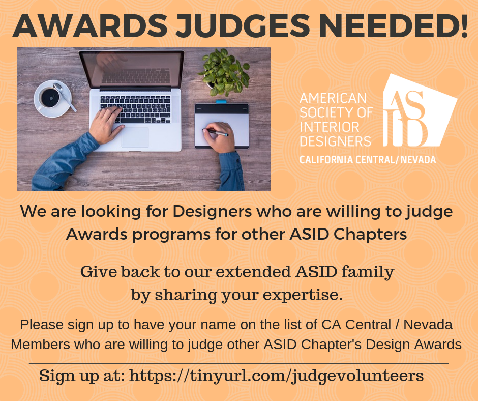 Please let us know if you are willing to be added to our list of judge volunteers. We send the list to other ASID Chapters who have requested help finding judges for their awards.