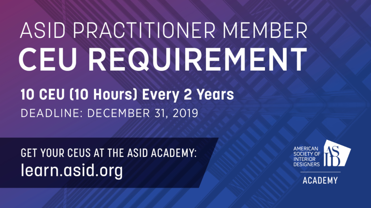 ASID members must earn a minimum of 1.0 unit (10 hours) of approved continuing education (CEU) every two years. The current reporting period will end on December 31, 2019, so now is the time to start working on your CEUs! ASID Academy is here to help.
