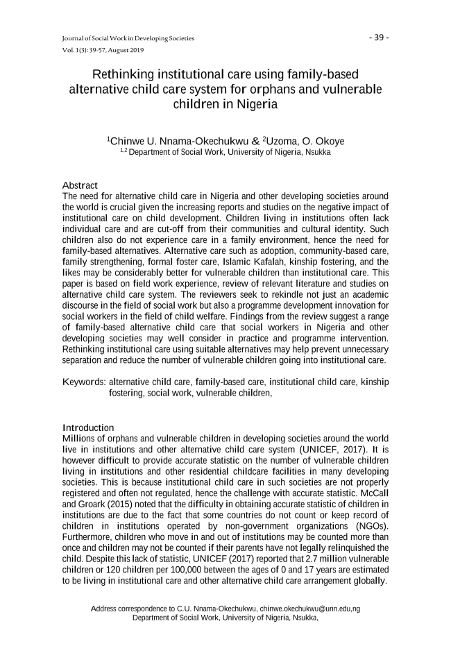 . Findings suggest a range of family-based alternative child care that social workers in Nigeria and other developing societies may well consider in practice and programme intervention to help prevent unnecessary separation and reduce the number of vulnerable children going into institutional care.