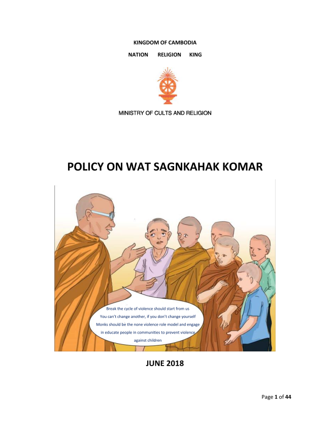In response to the Cambodia Study on Violence against Children of 2013, the Cambodian Ministry of Cults and Religion and The Supreme Patriarch Council, in cooperation with UNICEF, committed to promoting the role of pagodas and monks in effective prevention and response to violence against children and unnecessary family separation and to taking actions to improve the safety of children both within the pagoda compounds and in communities. This Wat Sangkahak Komar policy (or Child Safeguarding Policy) is part of those ongoing efforts within pagodas in