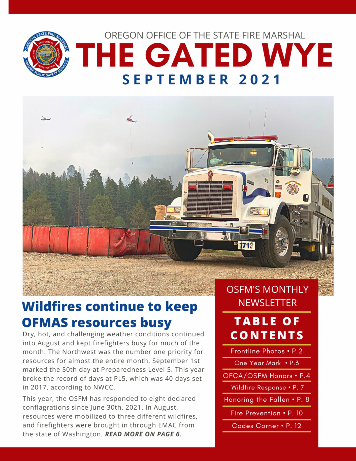 The September 2021 edition of the Gated Wye is here! August continued to be a busy month for the Oregon fire service responding to wildfires across the state. In the September issue of The Gated Wye read about the Oregon Fire Service's response to wildfires in August. Also in this issue, a look back at the Labor Day Fires of 2020 as Oregon marks 1 year. We share what has changed and how the recovery is going.