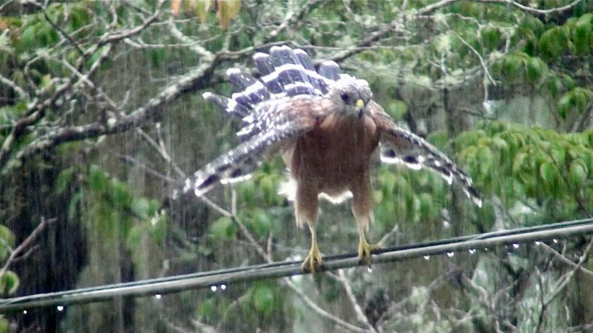 On August 27, my husband and I watched in amazement as a Red-shouldered Hawk took a rain bath during a storm, perched on a power line outside our front door. Its bath was interrupted briefly when it was dive-bombed by a male Northern Cardinal who was not at all pleased at the hawk’s presence. Happily, I had time to grab my camcorder and recorded most of the hawk’s bath and the dive-bomb episode. It’s posted on YouTube and here’s the link: Red-shouldered Hawk Rain Bath