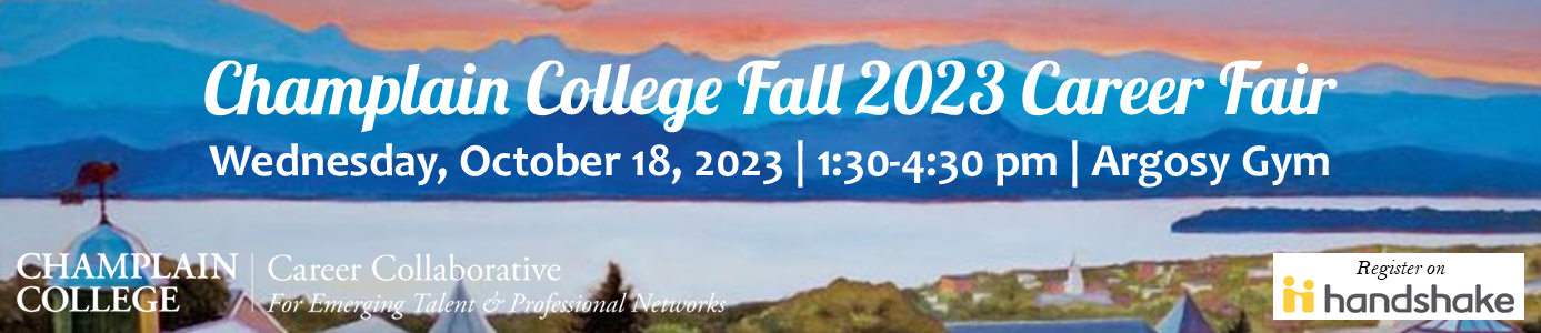 Champlain College is hosting a Fall 2023 Career Fair on campus on Wednesday, October 18, 2022, from 1:30-4:30 p.m.