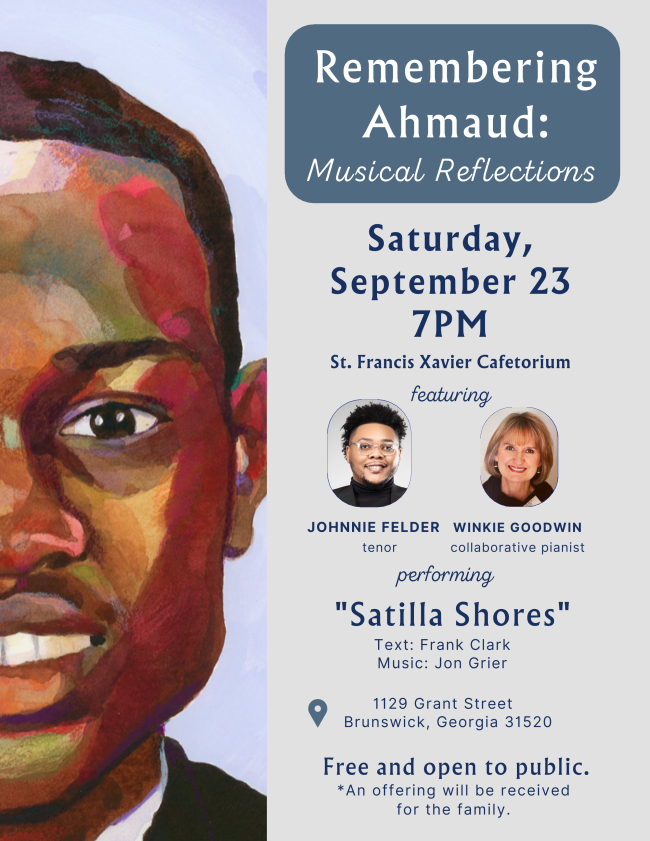 During the time Bob was a pastor at St. Simons Presbyterian Church, I taught at Altama Elementary School in Brunswick. Ahmaud was a student there and for 6 years we sang, danced, and played instruments together. I followed the news of his murder and subsequent trial of those responsible with grief and helplessness. Last fall, I attended a concert at my church in Columbia, SC to hear a song written by a former church member. I was stunned to find that the work was entitled "Satilla Shores" and was about Ahmaud and his death while out on a run in that community. After the concert, I shared with the poet and performers that I had taught in Brunswick and known Ahmaud. We began right then to dream of presenting the music to Ahmaud's family and friends in his own town. "Satilla Shores" is 15 minutes long and will be followed by spirituals and inspirational songs.