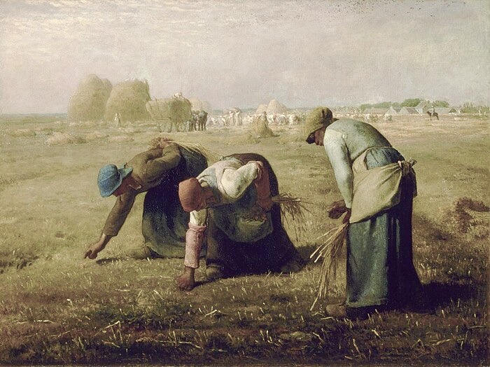 "The Gleaners" by Jean-François Millet, 1857, depicts three French peasant women cleaning a field of left over stray stalks of wheat after the harvest. The painting portrays a realistic view of poverty and the lower working class. The French middle and upper classes did not like this painting, as they thought it glorified the lower class.