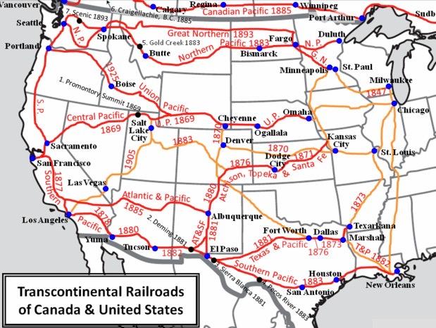 The Great Northern and Northern Pacific, the Union Pacific and Central Pacific, and the Southern Pacific and Texas Pacific were the major railroads. Railroad companies worked to encourage folks to buy tickets and move west. At this time passenger traffic was their main focus --- it changed later. | |