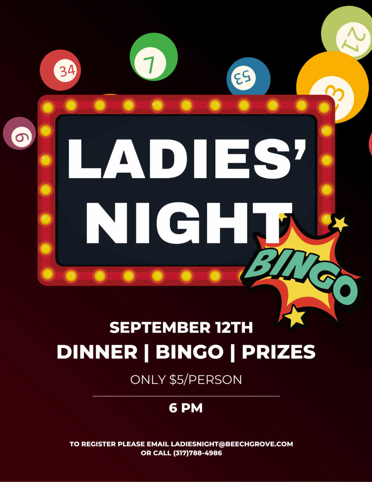 September's Ladies' Night activity will be a game night favorite - BINGO! Join us and try your luck at winning a prize. Please RSVP if you plan to attend so we can plan accordingly.