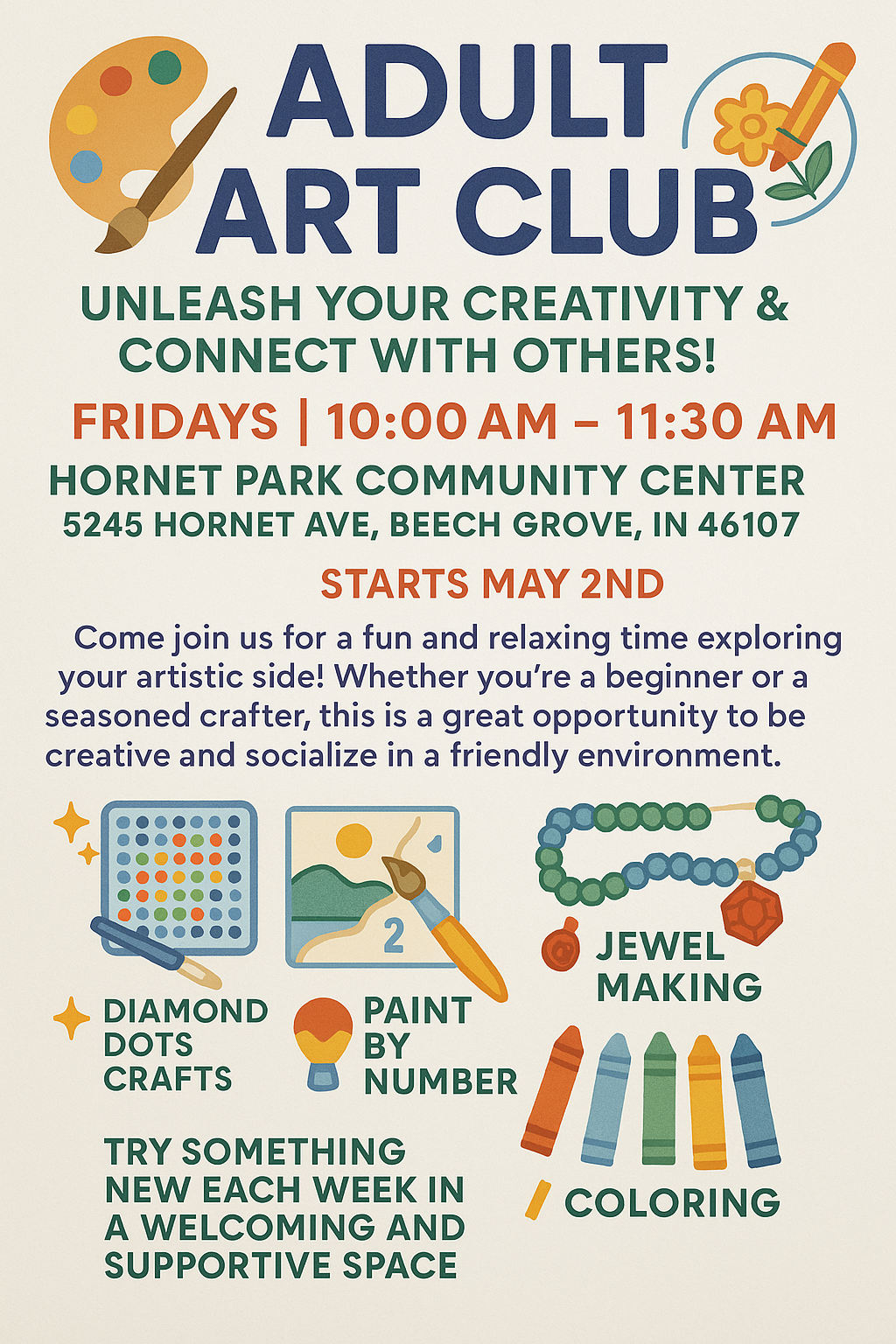 Our friends from Easter Seals are leading a weekly art club for adults each Friday morning. Plan to join us for this free event. It is a great way to meet new friends and learn something new.