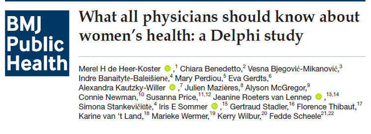 Our study could influence guidelines, to include topics from our list, or to critically assess whether women’s health is represented in guidelines. Policy-makers can use the results of this study as a discussion point and reference. For medical education, this study is also a starting point to include women’s health throughout the curriculum (women’s health must not be solely focused on the female reproductive system).
