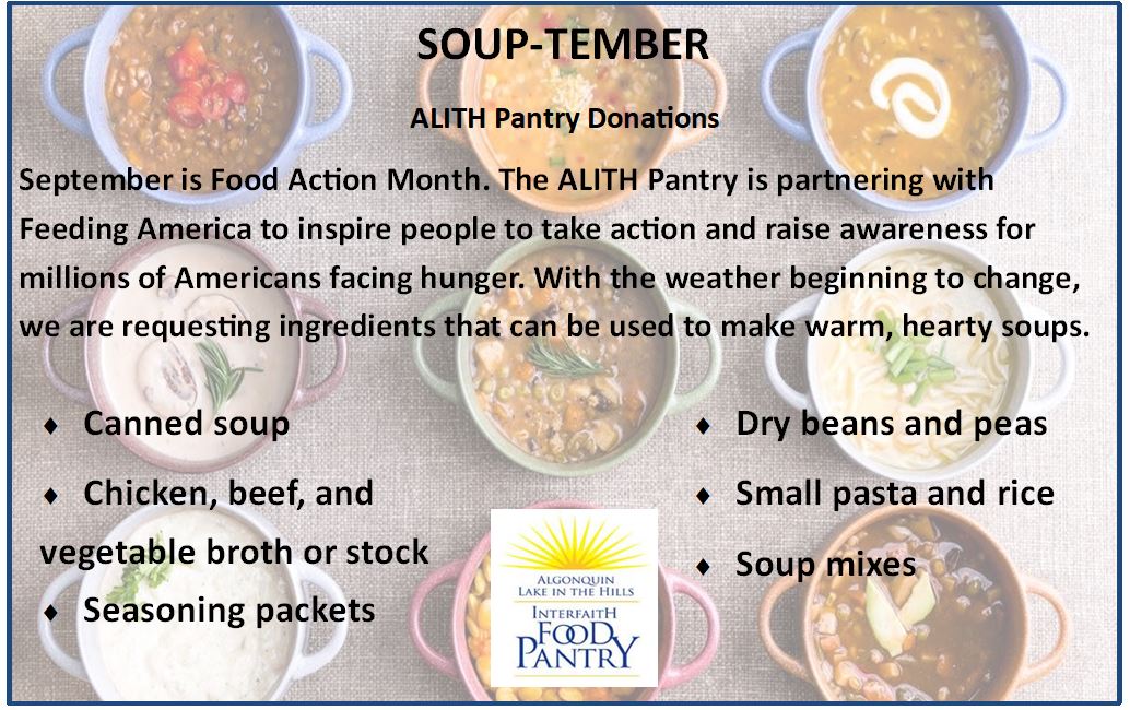The Ministry of Missions is looking for donations of items for hygiene kits that will be available to Algonquin/Lake In The Hills Food Pantry clients. We are looking for donations of toothbrushes, travel sized toothpaste, deodorant, hand sanitizer, hand lotion, and Kleenex. Monetary donations are welcome. A collection box will be in the Coat Room until September 28th.