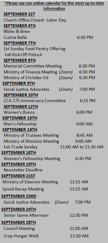 Even though the search committee will be beginning their work, our work as a transition team will not end just yet. So, our next Let’s Talk Church themed event will actually take place during worship on September 28. And all we’re going to say about that is come with an open mind to help us further explore and consider what our future may look and feel like if we are willing to let the spirit move us; or what has been dubbed “fresh expressions.”