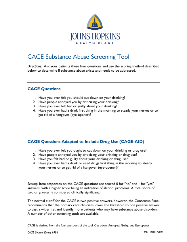 | | This quick, four-question CAGE screening tool helps identify potential alcohol or drug abuse. Easy to administer and score, it flags issues early, enabling timely intervention. Whether you're a clinician or concerned individual, this flyer outlines a simple, effective method to open the door to important conversations about substance use. | | State of Illinois overdose action plan | The State of Illinois Overdose Action Plan outlines a comprehensive, multi-agency strategy to reduce overdose deaths. It prioritizes harm reduction, treatment, prevention, social equity and justice-involved populations while addressing racial disparities, structural barriers, stigma and expanding equitable access to inclusive, culturally responsive, lifesaving services. | |