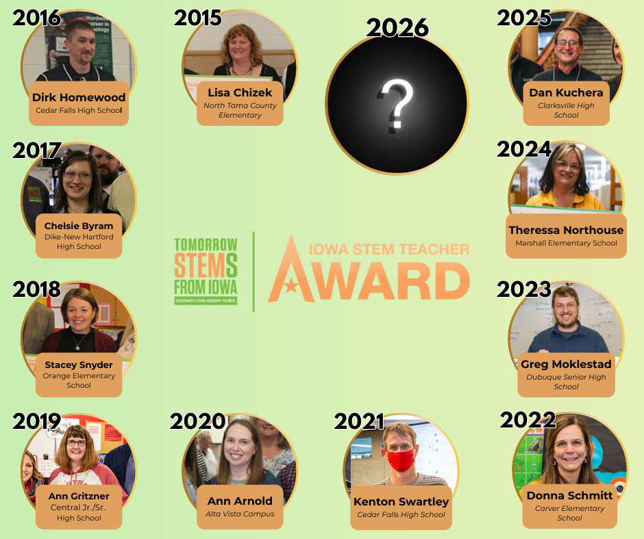 The Iowa Governor’s STEM Advisory Council, in partnership with Google, is now accepting nominations for the 2026 Iowa STEM Teacher Award through October 22.