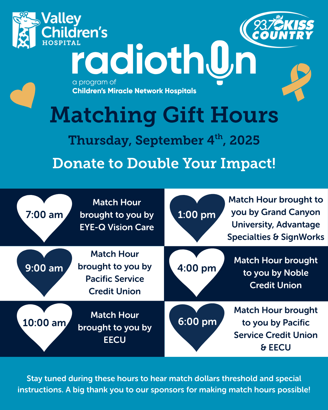 Take note of the Match Hours listed below, made possible by our generous sponsors. Giving during these times means your donation will go twice as far!