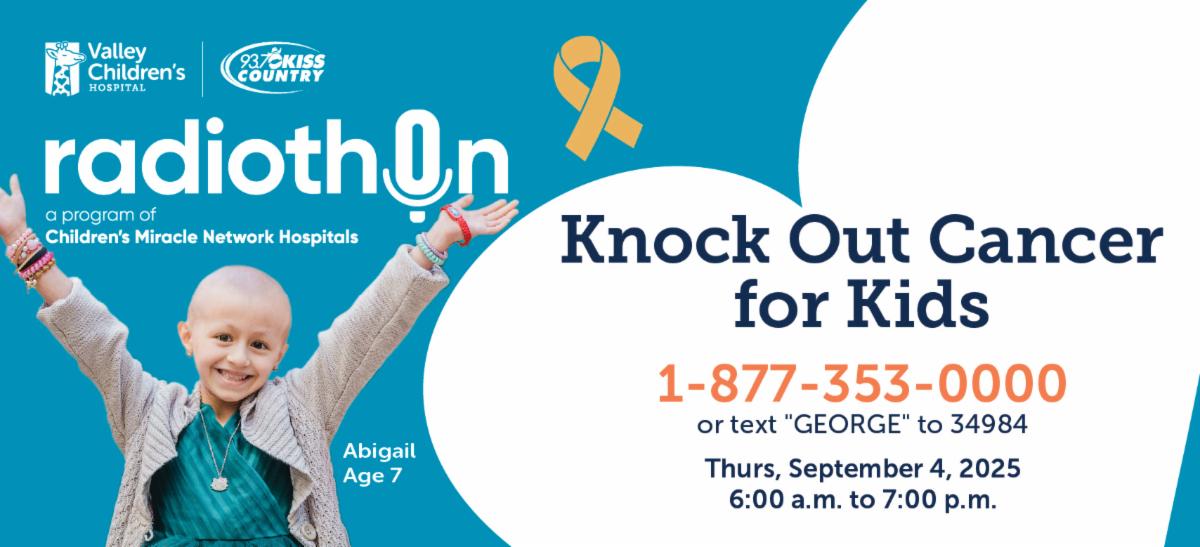 The 27th Annual KISS Country for Kids Radiothon to “Knock Out Cancer for Kids” is here! Tune in today, from 6a.m. to 7p.m. to 93.7FM as KISS Country radio hosts broadcast live from the hospital, sharing powerful stories of brave children like Abigail who are fighting cancer. Their incredible strength and resilience will inspire listeners and rally the community to come together in support.