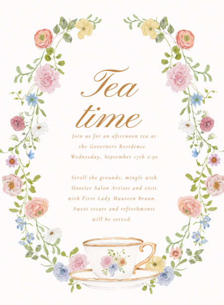 The Hoosier Art Salon invites all Psi Otes to join them for afternoon tea at the Indiana Governor's Residence, Wednesday, September 17, 2025, at 2:30 pm.