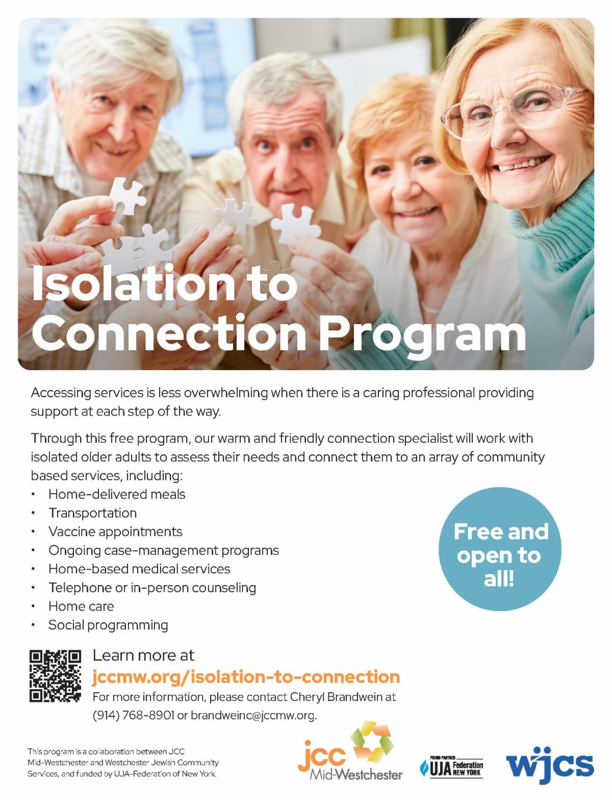 | | Isolation to Connection Program | | Isolation to Connection is a free program open to all, working with older adults, their families and caregivers to assess needs and connect the elderly to an array of community based services and resources including home delivered meals, transportation services and socialization opportunities. If you or any of your loved ones, friends, or neighbors need help navigating aging services, resources and/or programs, please let them know about this program. Click here to learn more about the program. | | |