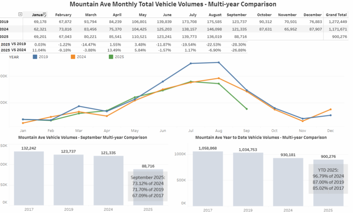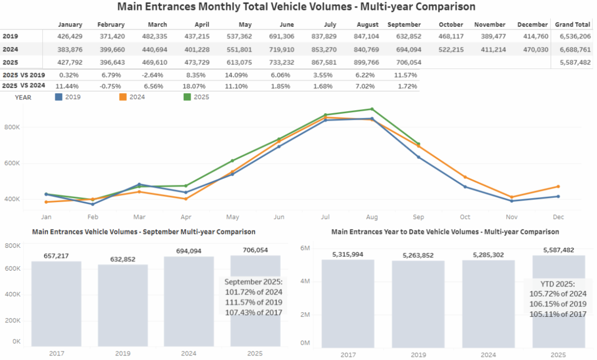 Total Vehicle Volume year-to-date (YTD): This number references the total number of vehicles recorded (both incoming and outgoing combined) between January 1 and the end of the reporting month at traffic count stations identified above.