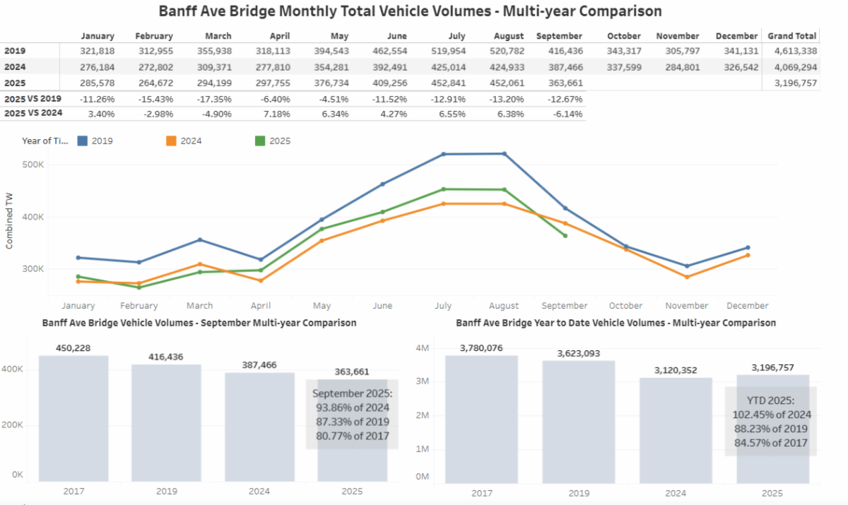 The town is now tracking License plate data at town entrances. This will provide insights into the geographic origin of visitors, including U.S. tourists taking advantage of a stronger dollar, and residents of Calgary and surrounding areas. In 2025, about 18% of vehicles entering Banff are registered in Calgary. These insights will support data-driven planning.