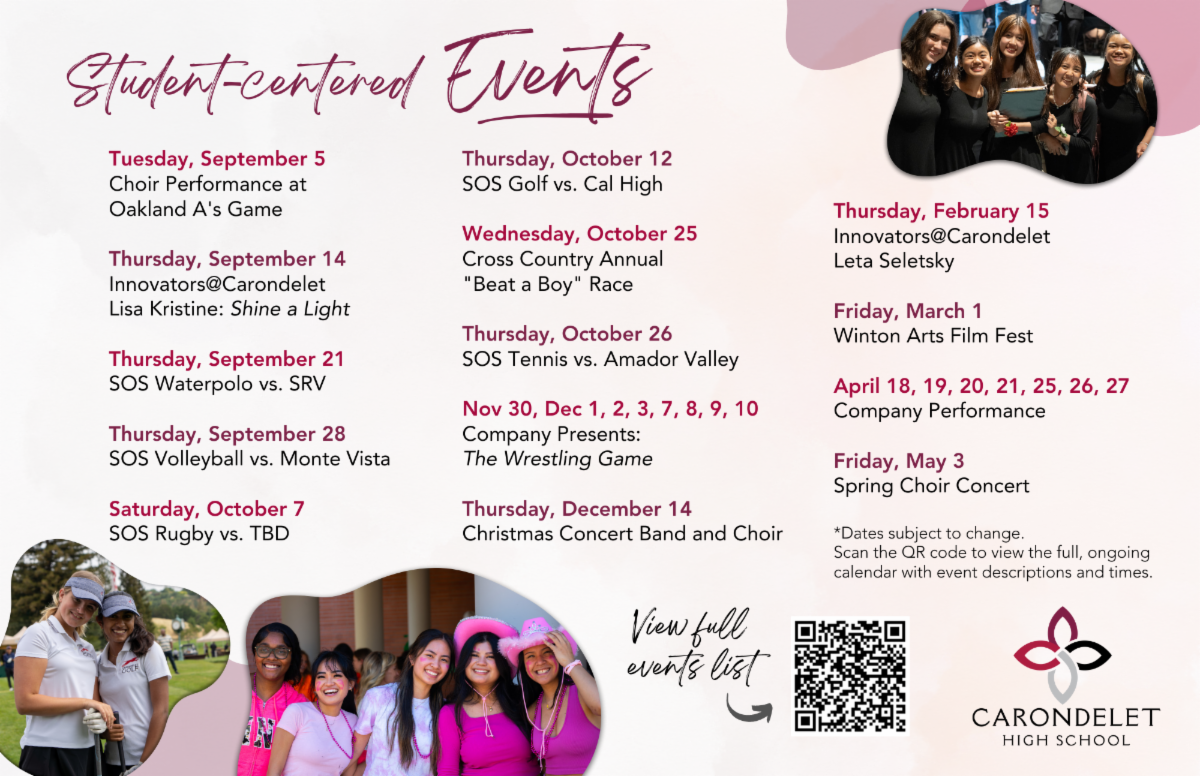 On Friday, 9/8 at lunch, we are holding our Carondelet Club Fair in the Amp. Students will have a chance to visit and learn about more than 50 clubs on campus and sign up to participate. Lots of clubs and interests from Arts and Crafts Club to Mock Trial to Honor Societies are available to explore. Clubs are a great way to get involved on campus, and Club Fair is a fun event for all. De La Salle will also be holding their club fair at the same time, so students can check out those clubs as well. We will also be hosting an Affinity Club Showcase in the Amp on Thursday in advance of Club Fair—come check it out! Celebrations of a variety of heritage months will begin in September with Hispanic Heritage Month, which kicks off on September 15. More info to come!