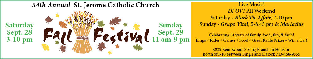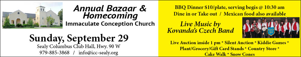 The parish annual Homecoming Picnic is set for Sunday. The day starts with Mass at 10:15 am, dinner starting at 11 am, and games and booths opening at noon. You'll love the home-fried chicken and sausage dinner served with all the trimmings. Praha Brothers will provide the music from 12:30-3:30 pm in the Vrazel Polka Band Pavilion. Sign up at 11 am to play in the horseshoe tournament with cash payout for first-third places. The auction starts at 3 pm followed by the raffle drawing. Enjoy the games, auction, and entertainment for the entire family.