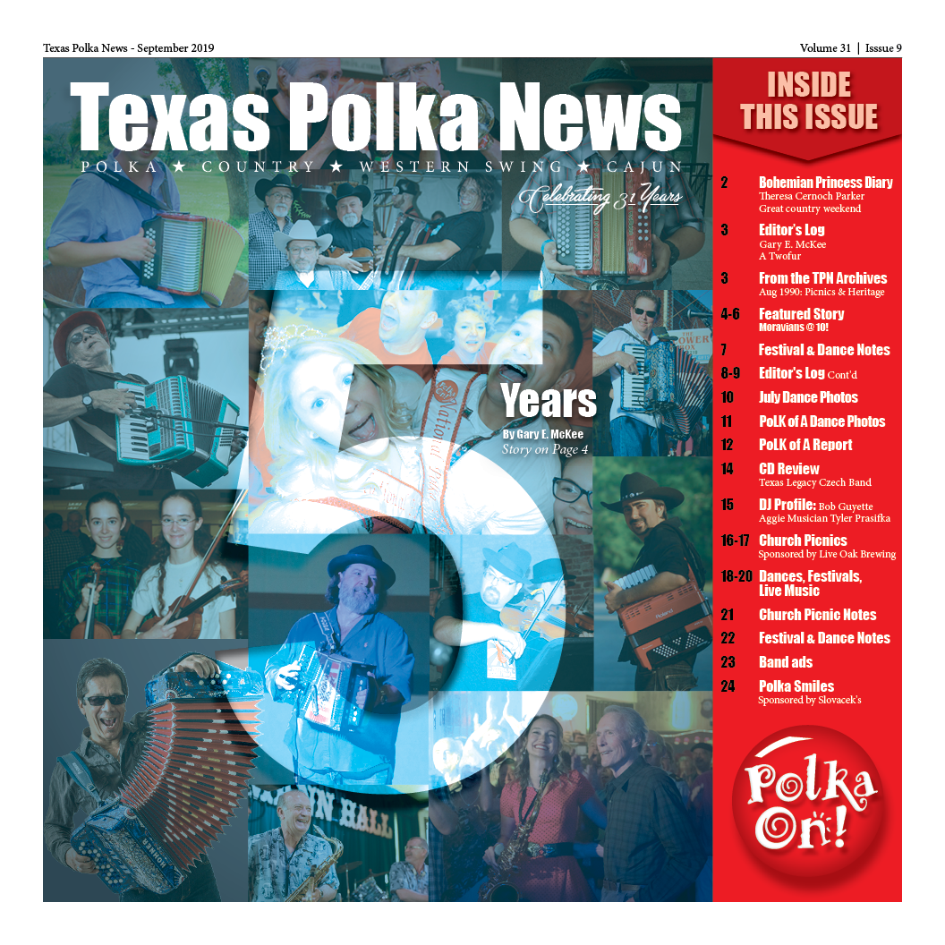 Happy 5th anniversary to Theresa Parker and Gary McKee. Yes, they have been publishing the Texas Polka News for 5 years! Theresa and Gary reflect on this accomplishment. This issue has lots of photos and recaps the polka ride over the past 5 years. Gary also gives a thumbs up to dancers in training - those young kids having fun on the dance floor. Justin Everett reviews an oldie but a goodie CD by the Red Ravens and profiles DJ Heidi from Denton. He also helps us remember Rosie Mikula who recently passed away. Festival season has begun. Learn more about the Western Swing & BBQ Festival in Lockhart, Raise the Roof Fundraiser at Twin Sisters Dance Hall in Blanco, Schuetzenfest in Round Top, Kolache Fest in Hallettsville is celebrating its 25th year, Kolache Fest in Caldwell is celebrating its 35th year, and get ready for the Oktoberfest circuit - Fort Worth, McKinney, Houston, San Antonio, and Victoria. Of course, we have your September calendar of dances, festivals, and live music events, and the listing of church picnics. Visit texaspolkanews.com to see the latest issue. Visit texaspolkanews.com to see the latest issue.