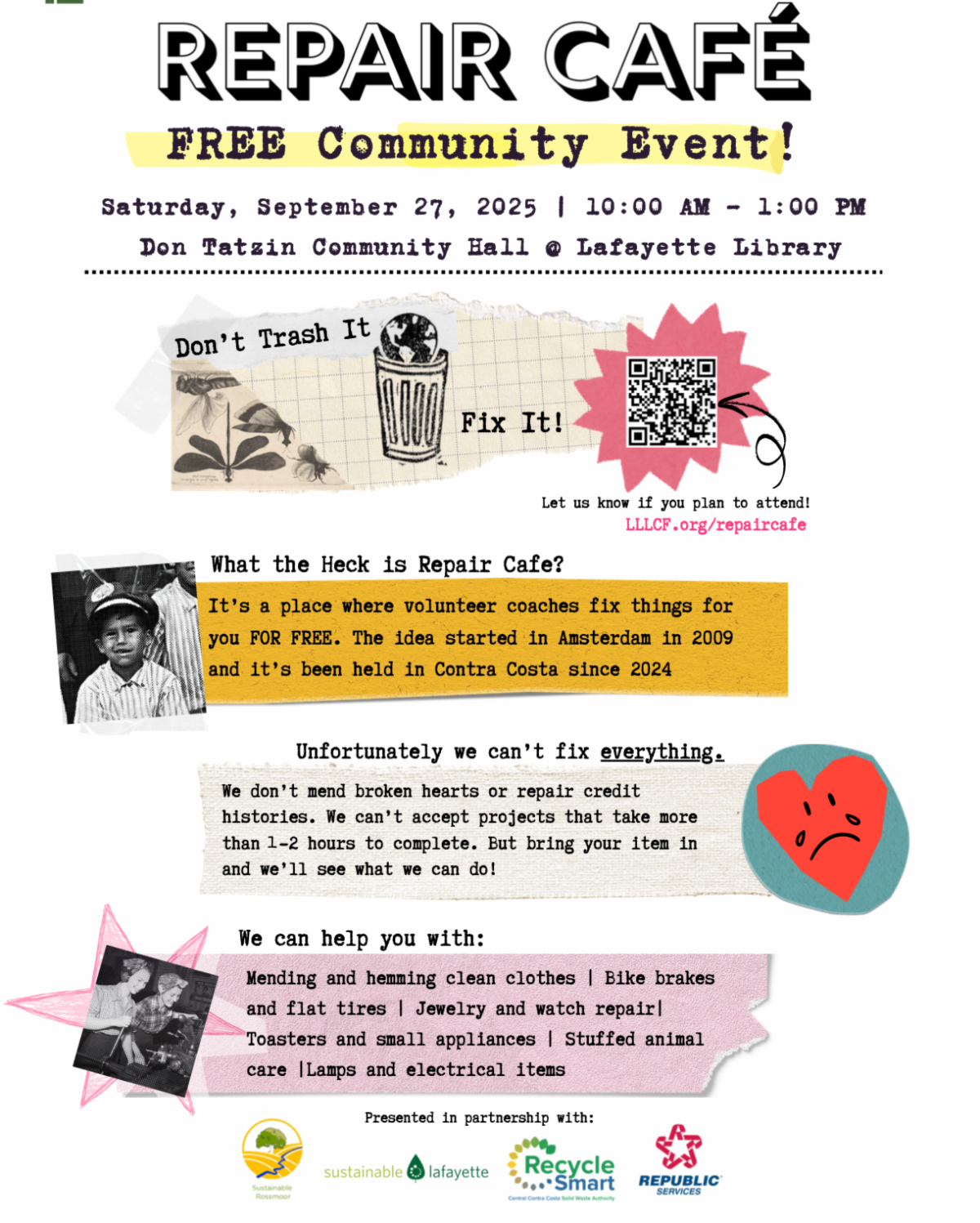 The Library Foundation, will host this free community event on Saturday, September 27th. The event is a partnership with Sustainable Rossmoor, Recycle Smart, Sustainable Lafayette and Republic Services.