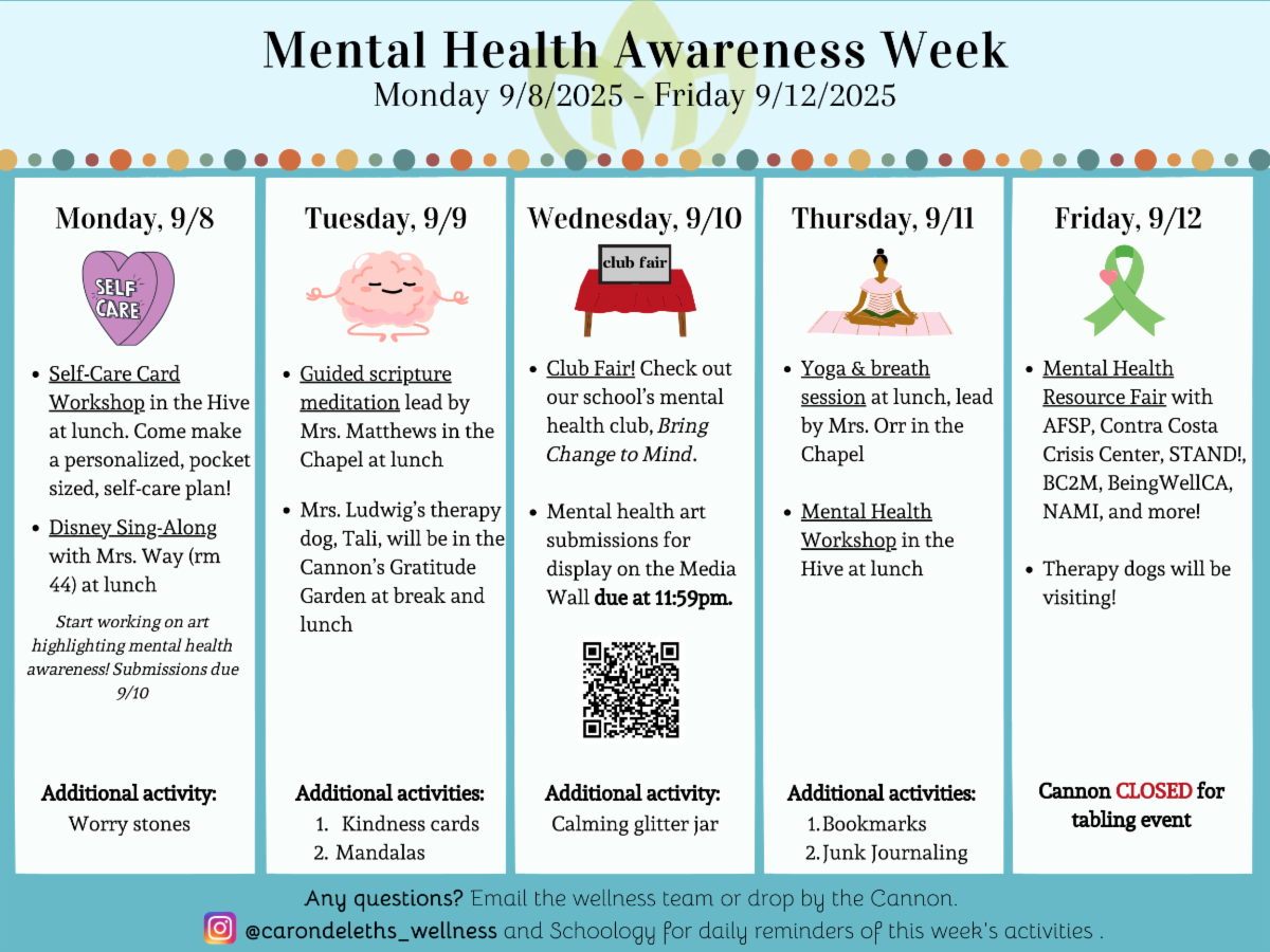 September is National Suicide Prevention Month, and this upcoming week our community will highlight mental health awareness through a variety of campus activities and programming. Details of the offerings can be found below. We encourage families to continue these important conversations at home, as open communication plays a key role in student well-being.