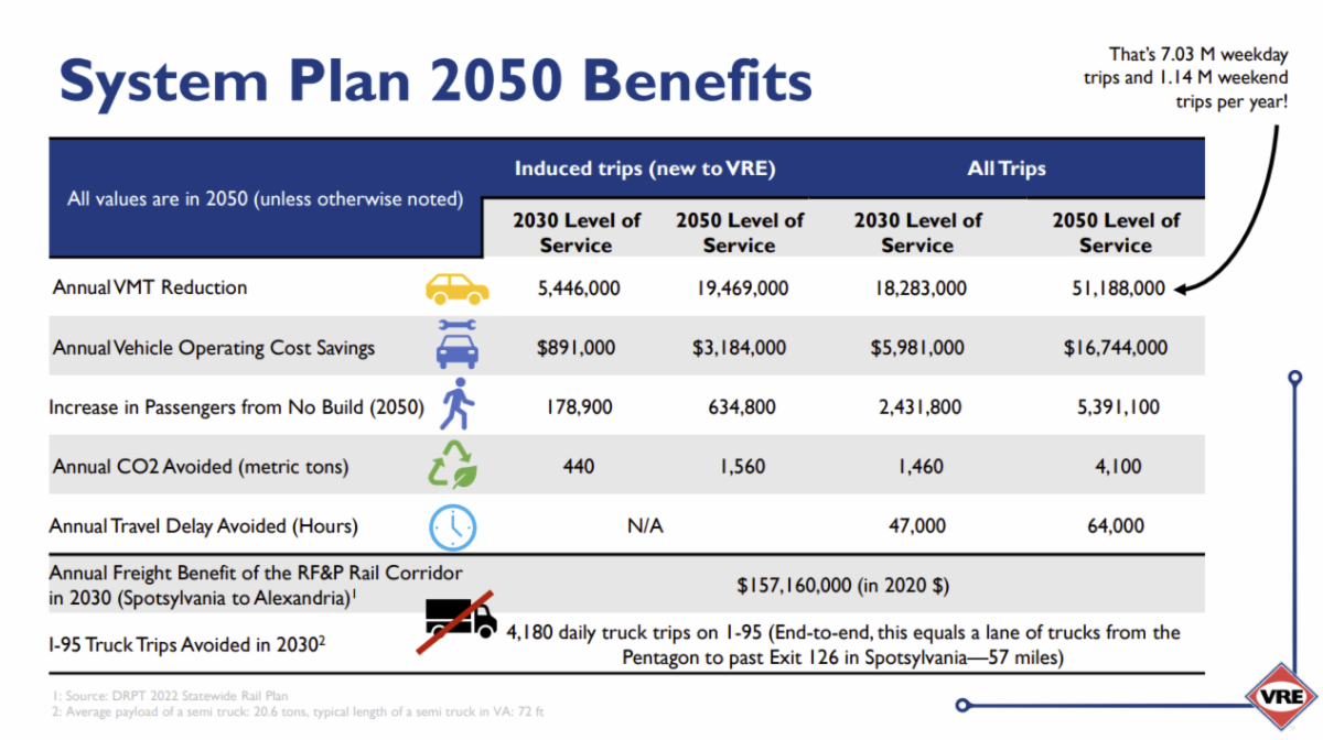 Dallas Richards, Deputy CEO and Chief Engineer, VRE, and Nick Ruiz, AICP, Planning Program Manager, VRE, presented an overview of the System Plan 2050 to the Authority. Benefits of the plan include: