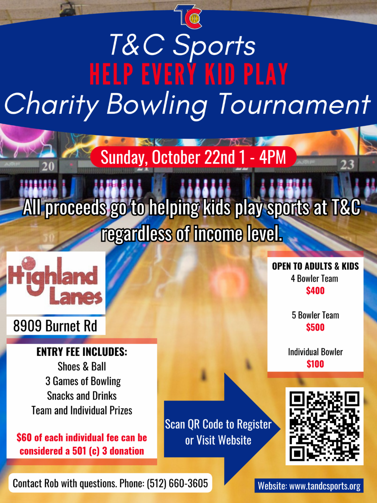 At T&C, we want to help every kid play. So each year, we hold a fundraiser event with the proceeds going to reduce the costs to play sports, especially for low-income families. T&C will be hosting our annual βHelp Every Kid Playβ Charity Bowling Tournament at Highland Lanes this year on October 22nd so I hope to get to see many of you at this event.