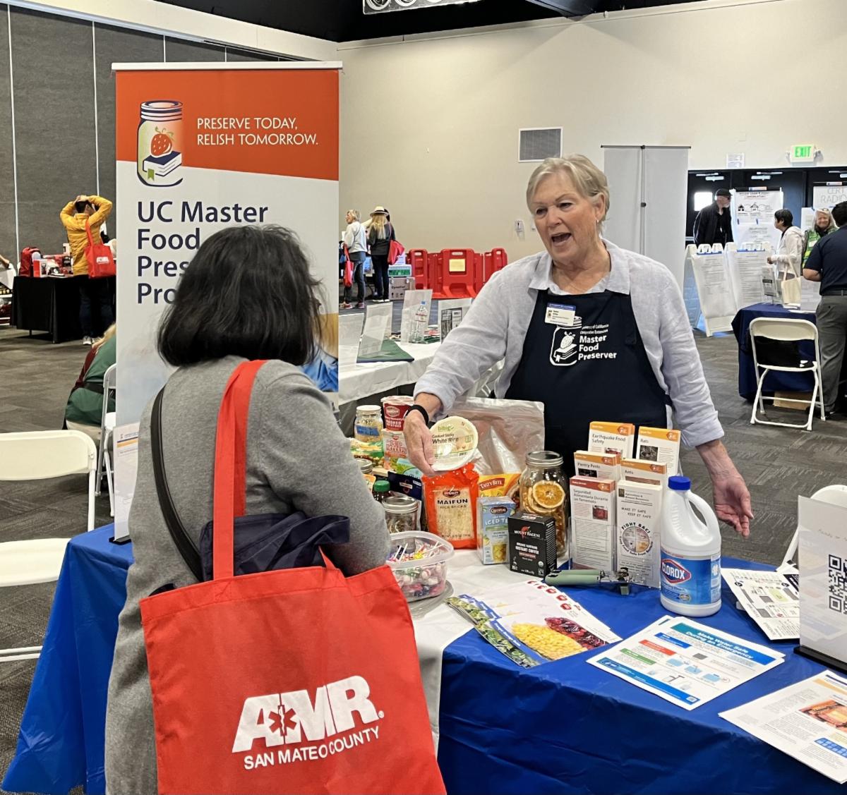 At left: MFP Karen at the San Mateo County Emergency Preparedness Day discusses food safety (Aug. 2025)
