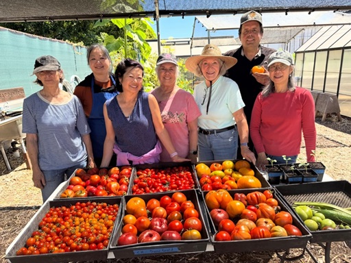 | | Pictured above: MGs at the GEC in San Mateo showing off their bumper crop of tomatoes. | | Pictured above: Imparting the wisdom of many years of gardening to visitors at the monthly GEC Open Gardens. Held the first Wednesday of each month. | | |