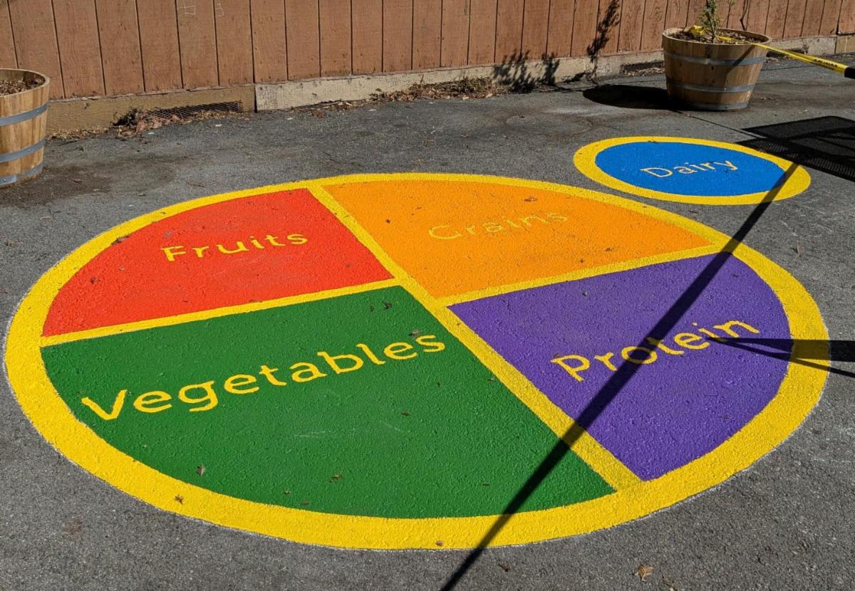 The effort to promote active play extended to the playground as well. Working with CFHL UCCE, the school added colorful stencils to the blacktop, transforming it into a vibrant space for movement. Students now enjoy a variety of activities (targets, four square, hopscotch, ABCs, shapes, and more) that encourage both structured play in PE and imaginative play during recess.