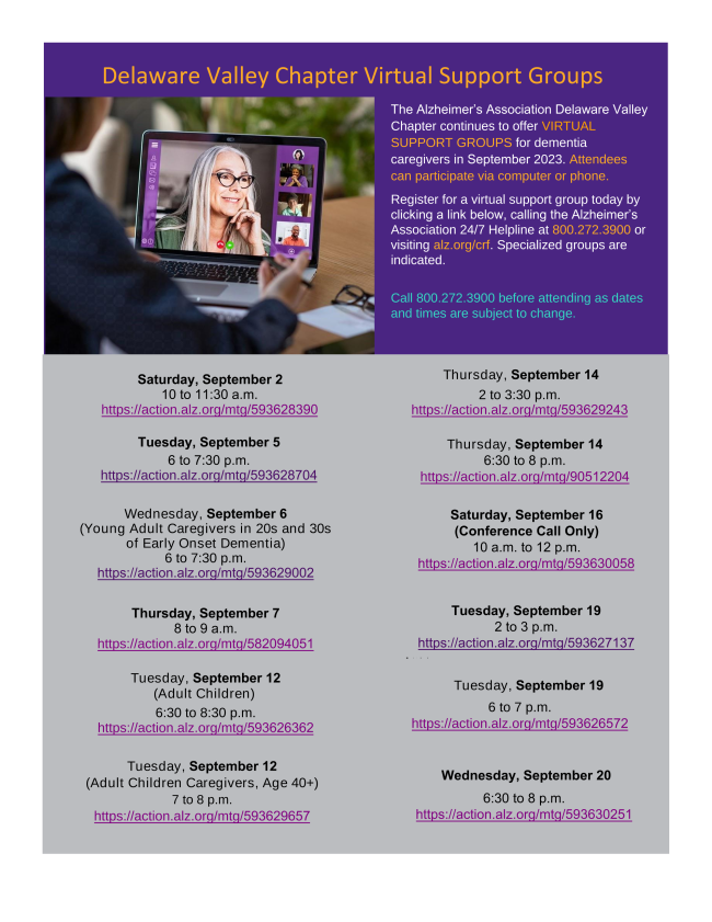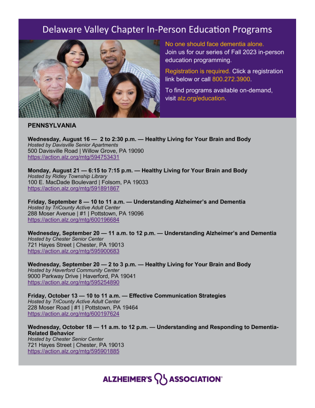 Join the Alzheimer's Association Delaware Valley Chapter for one of the many education programs in your community, or share the information with someone who can use it. Want to engage with the Alzheimer's Association? Contact them to host/schedule a program for your community members or corporation, become a volunteer, form a team for the Walk to End Alzheimer's or schedule an awareness presentation.