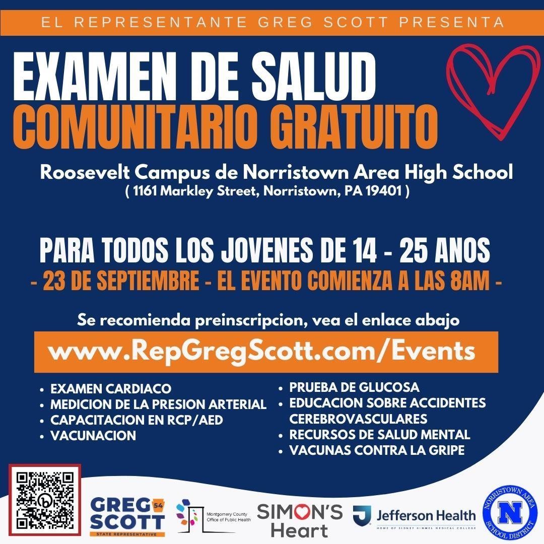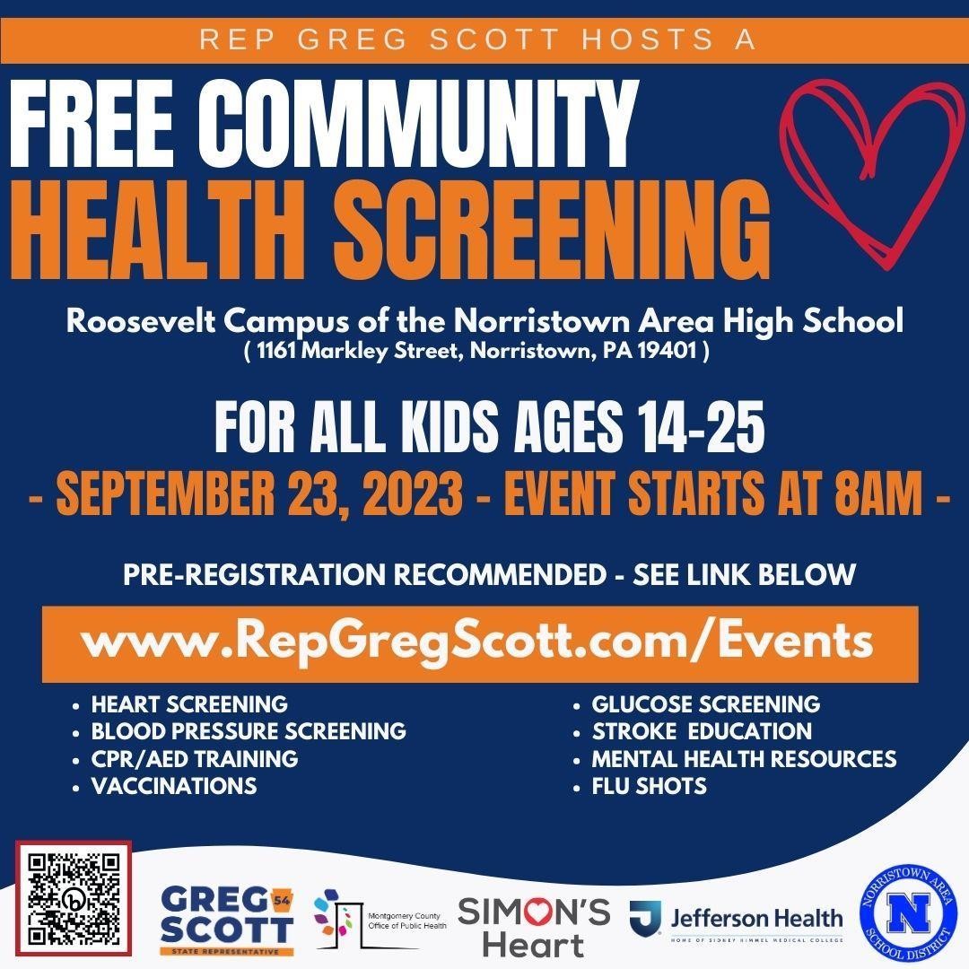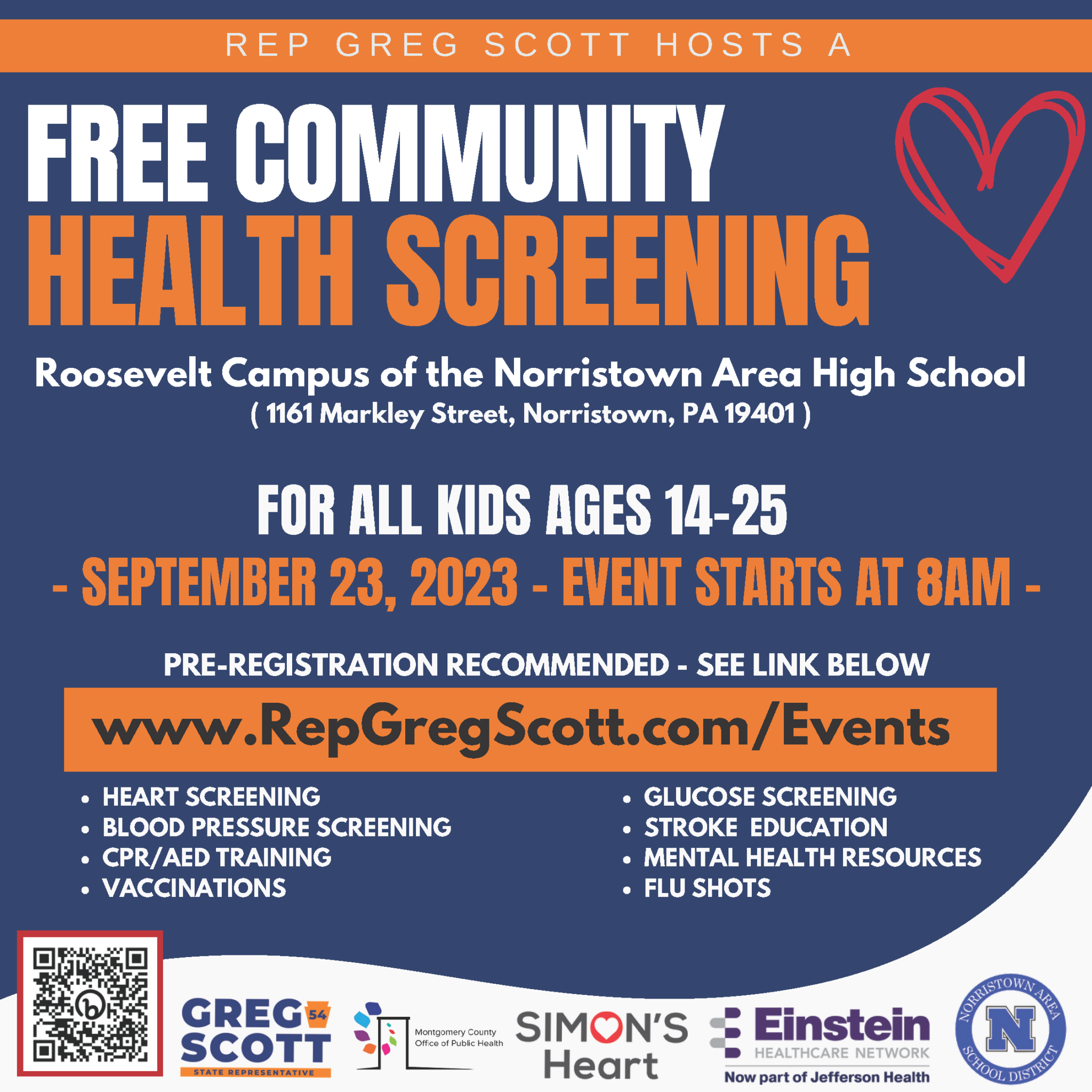 A Message from Representative Greg Scott: “Sudden cardiac arrest is the leading cause of death among student athletes. Despite the lethality and prevalence of the condition, there is no requirement that students be screened for its risk factors. After having 5 local students die, my team and I have conducted CPR classes, donated AED machines and now I am inviting you to my free Community Heart Health Screening event on September 23 starting at 8 a.m., Roosevelt Campus of the Norristown Area High School. This event is intended for young people ages 14-25 and we will be offering FREE heart screenings, blood pressure screening, stroke education, flu shots and so much more. At this event, students can also have their PIAA physical completed for the 2023-24 school year." Pre-register here.