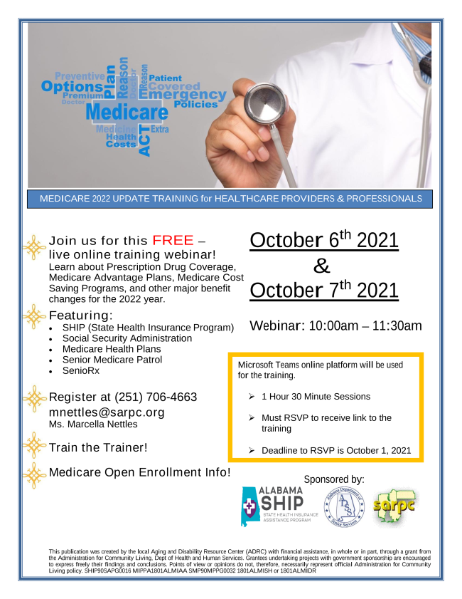 The South Alabama Regional Planning Commission operates a three county Aging and Disability Resource call center(ADRC) 8:00-5:00 daily that serves as a comprehensive source of information about local resources and services for older adults, caregivers and persons with disabilities for Mobile, Baldwin and Escambia counties in Alabama. The ADRC does intake for all Area Agency on Aging services, provides information and referral, short term case management, assists with Medicare counseling, and does eligibility screening and application assistance for public benefits. This is a highly responsible position overseeing development, quality, program management and client services. Preferred knowledge of community services, supervisory experience, and requires basic computer knowledge, ability to utilize agency data systems, and good rapport with the public, staff and community agencies. Requires a college degree and will require AIRS certification within a year. Benefits include participation in the Retirement System of Alabama, health, dental, life and short term disability benefits, and paid holidays and leave. Send resumes by October 22, 2021 to jmcgee@sarpc.org or to: