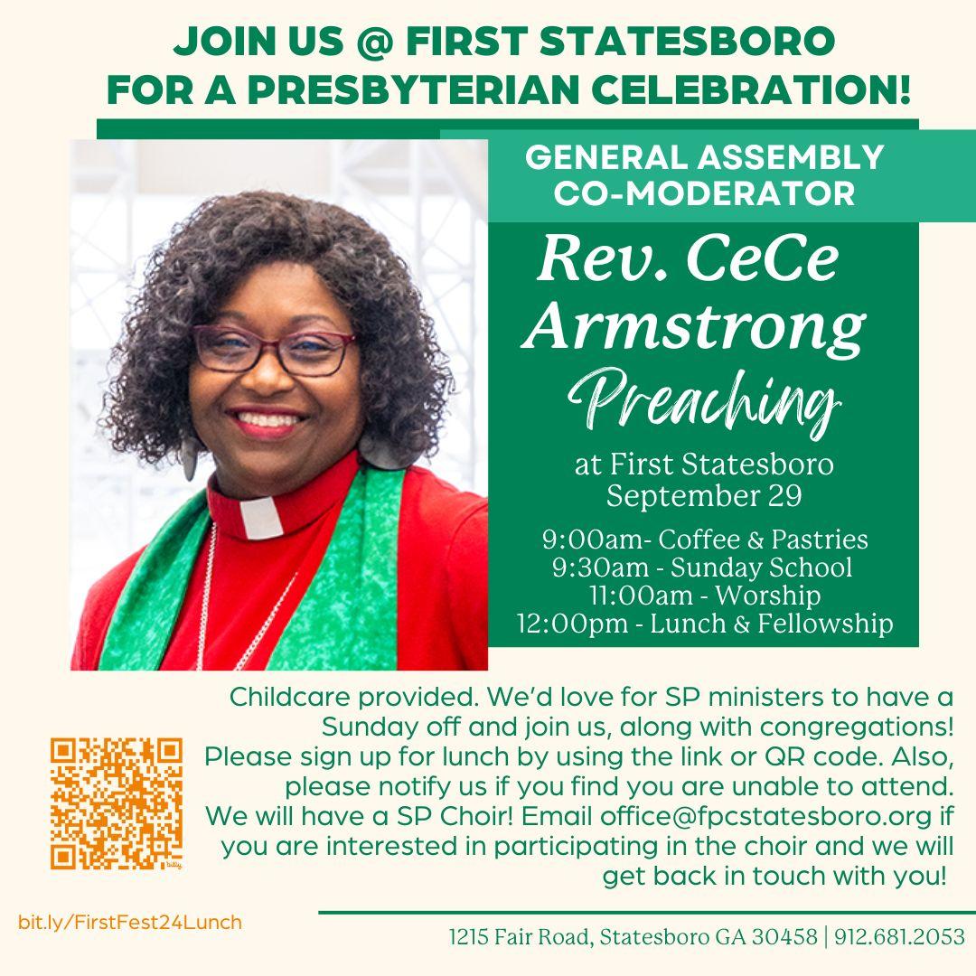 We at FPC Statesboro want to invite you and all SP congregations - especially our District 2 folks - to join us on Sunday, September 29 for a special morning with the Rev. CeCe Armstrong, Moderator of the 226th General Assembly as our preacher and Sunday School teacher.
