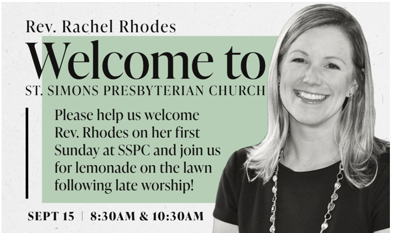 St. Simons Presbyterian Church has called Rev. Rachel Rhodes as its next pastor. Rachel begins her work at the church on Monday, September 9. Get to know Rachel through this video link on the church’s website: Staff - ST. SIMONS PRESBYTERIAN CHURCH (sspres.org) A service of installation will be held on a later date. | |