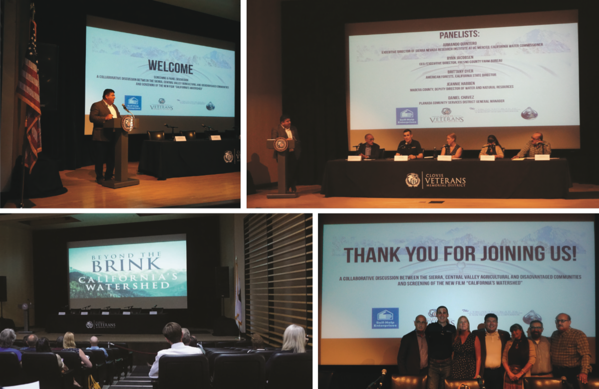 On September 24th, the Clovis Veterans Memorial District, The Chronicles Group, Inc., and Self-Help Enterprises held an expert panel discussion on possible collaborative efforts between Sierra watershed stakeholders, Valley farmers, government and disadvantaged communities. Prior to the discussion, attendees had an opportunity to view the documentary “California's Watershed” which focuses on the water and food nexus and its evolving implications for national security through the lens of the Sierra Watershed and the California Central Valley, a microcosm of this global crisis. Discussions touched on the watershed, water sources, groundwater, the representation of disadvantaged communities, existing research and more. There are plans to host another panel discussion in the near future.