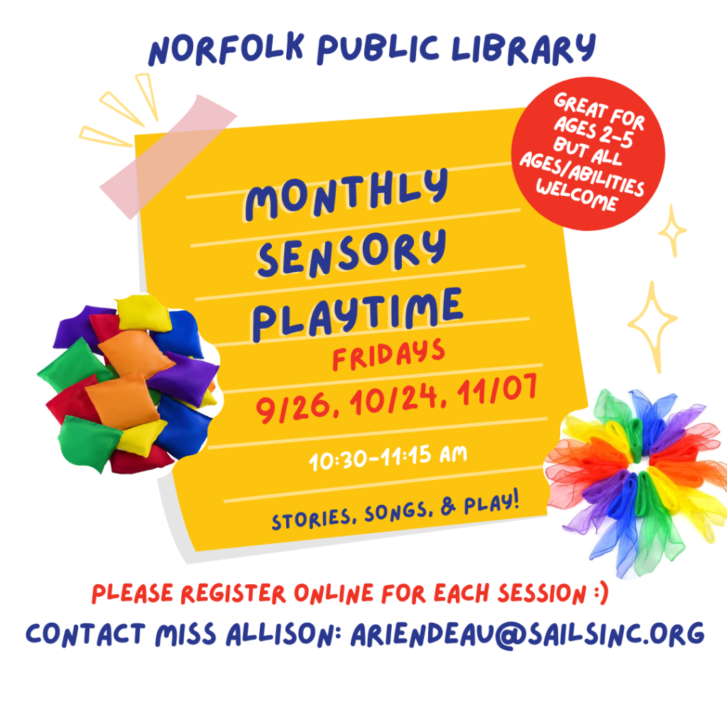 Join Miss Allison for stories, songs, and play! Children and their caregivers will spend 20 minutes enjoying songs, rhymes, and stories, followed by 20-25 minutes of sensory play (i. e. sensory bin play stations, a simple craft, or coloring).