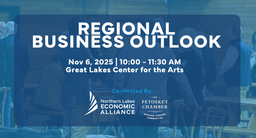 The Regional Business Outlook, co-hosted by the NLEA and Petoskey Regional Chamber of Commerce, will feature a panel discussion with business leaders representing diverse northern Michigan industries to share their outlook on both opportunities and challenges in the year ahead. Attendees will also be the first to learn the current regional business climate, labor force, and development news through a presentation of the fall edition of the NLEA’s Economic Pulse Report. Following the panel discussion, stick around for hors d'oeuvres and networking with leaders from across the region.