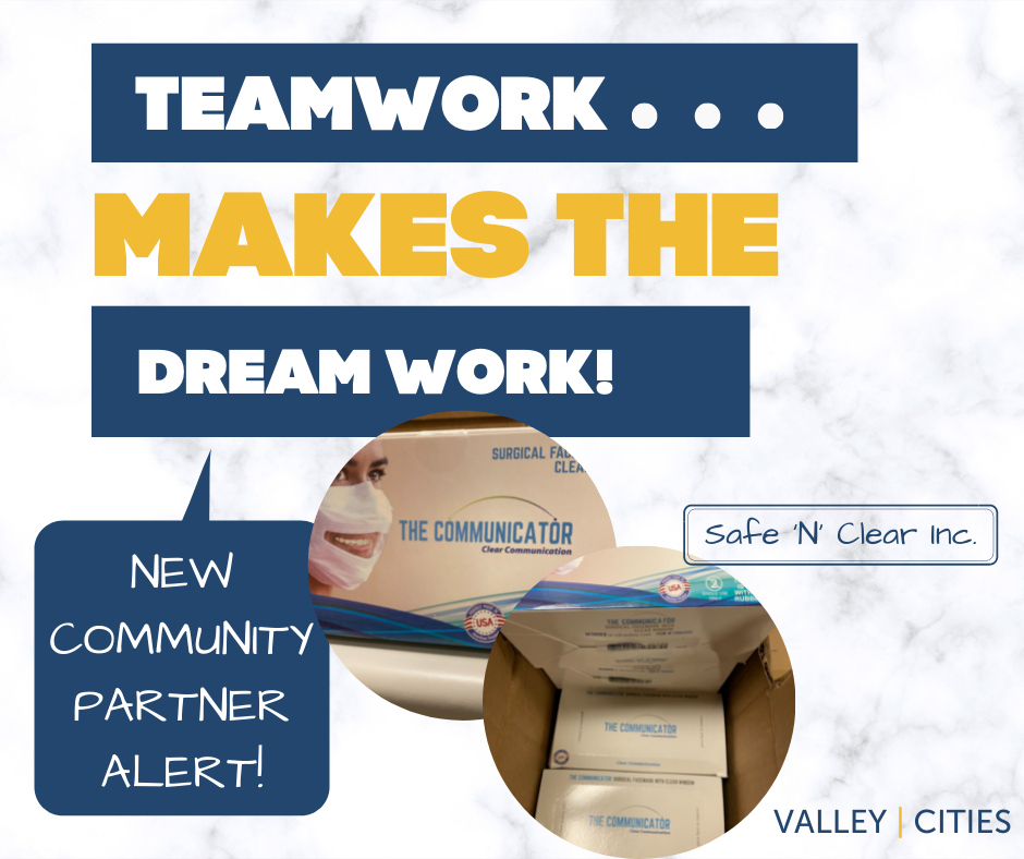 We are excited to announce a new partnership with Safe 'N' Clear! Thank you for supporting our staff and clients with your generous donation of clear masks. The new communicator mask is ADA-effective allowing Valley Cities to serve clients with accessible, transparent, and clear communication. More information about the mask can be found here-