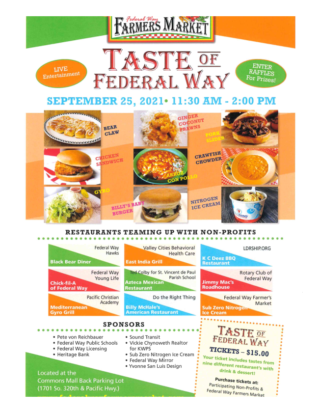 Taste of Federal Way is happening on 9-25-21 from 11:30AM to 2PM at the Federal Way Farmers Market. This year, East India Grill has teamed up with Valley Cities. Our banner with Valley Cities Behavioral Health Care will be displayed at the food tent for East India Grill, and Valley Cities will receive a portion of ticket sales.