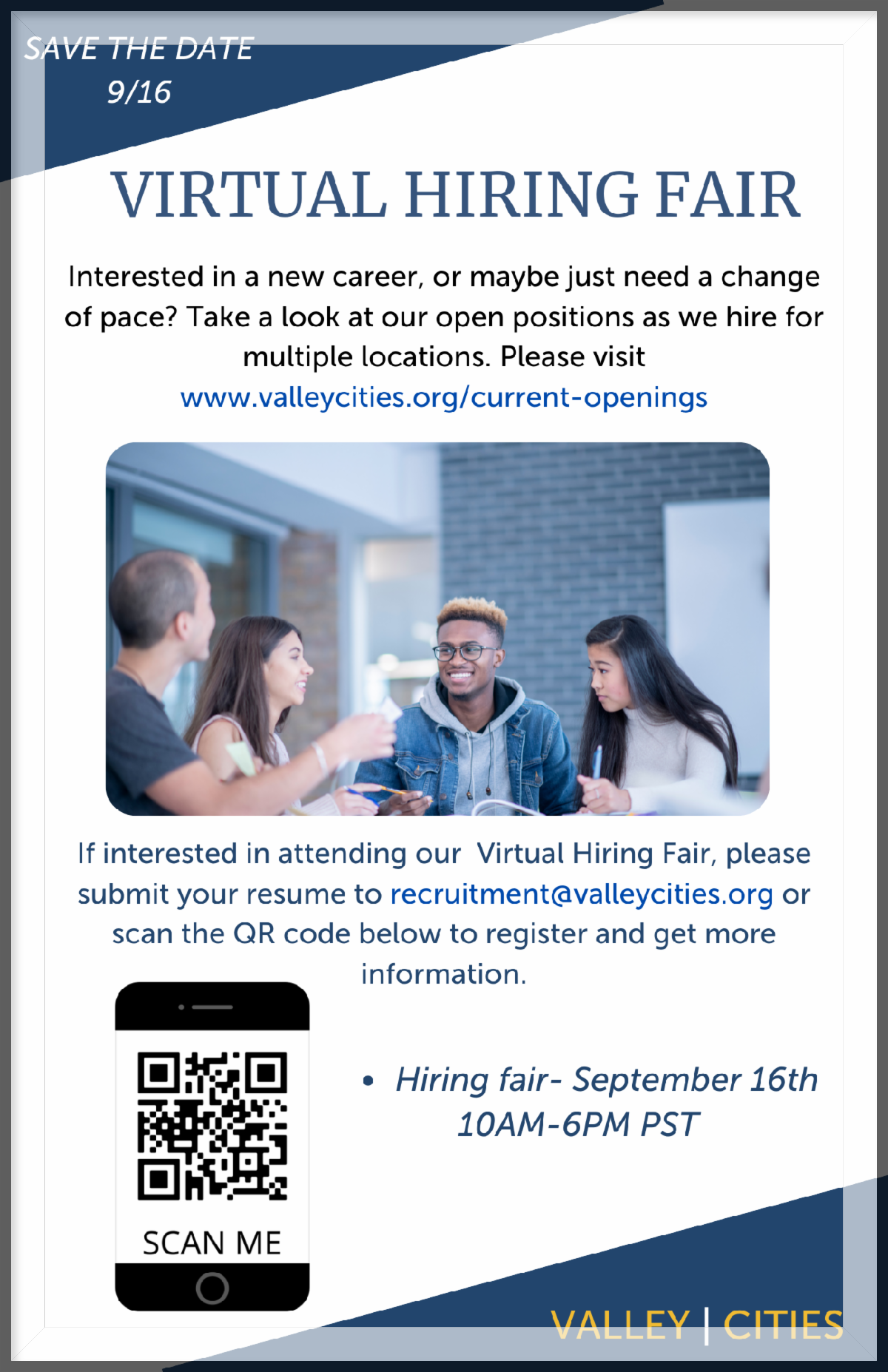 Prospective Board Members can explore our website www.valleycities.org to learn about our behavioral health care programs and support services including housing, crisis line, supportive employment, school-based counseling (outreach), and services for specific populations such as programming for LGBTQ+ youth and adults. Visit www.valleycities.org